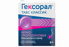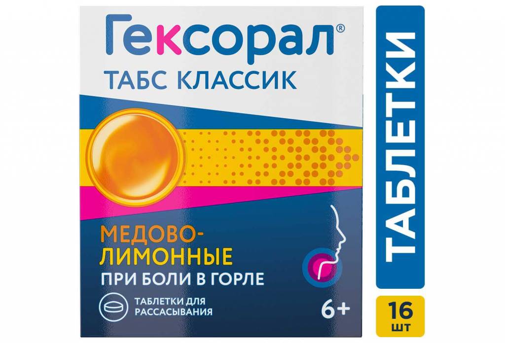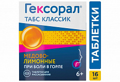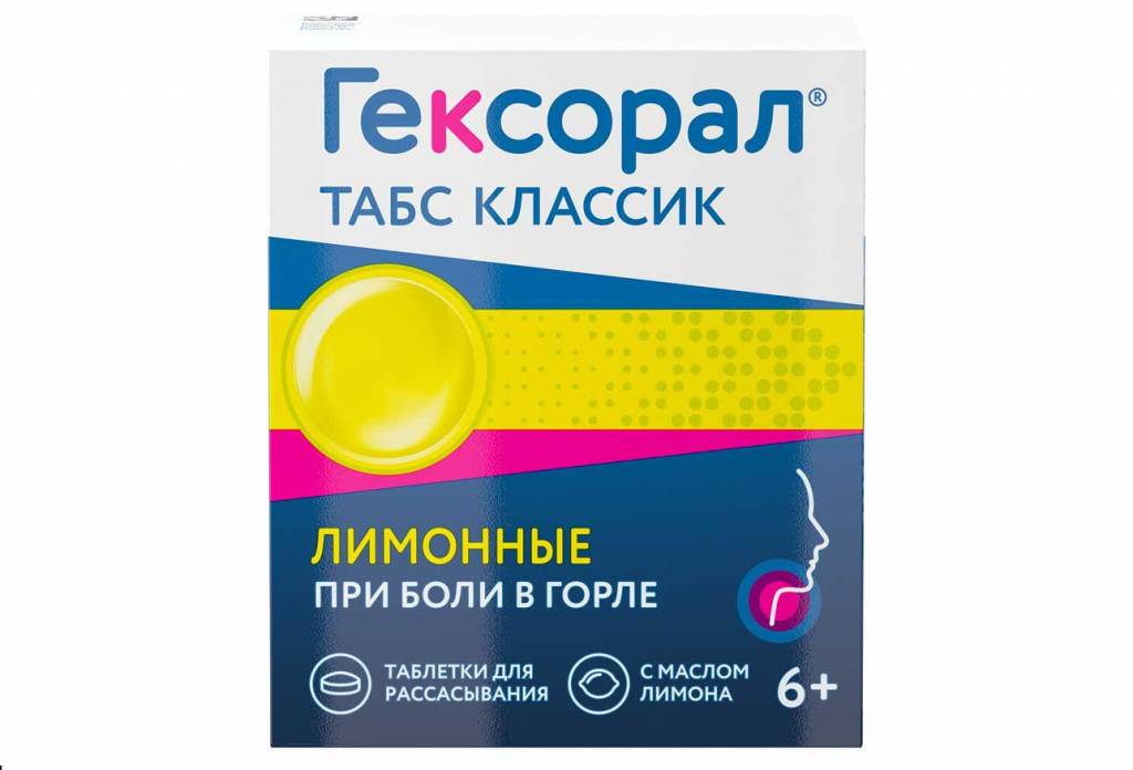Таблетки для рассасывания Гексорал® табс Классик лимонные направлены на ослабление боли в горле. Рекомендуется применять при первых симптомах боли в горле, а также при першении. Дополнительные компоненты - анис, лимон, масло мяты, входящие в состав, дают приятный, освежающий вкус. Таблетки от боли в горле Гексорал® табс Классик разрешены к применению детям от 6 лет и взрослым*. *Согласно инструкции по применению. Круглые двояковыпуклые таблетки желтого цвета с шероховатой поверхностью. Допускается неравномерность окрашивания, наличие пузырьков воздуха и незначительная неровность краев.