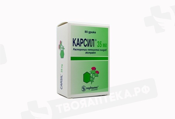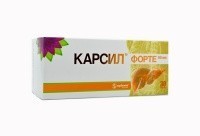 Препарат Карсил надежно защищает печень от токсинов, имеет натуральный состав и обладает высокой эффективностью в лечении патологий печени. Это проверенное временем лекарственное средство из Болгарии быстро восстанавливает поврежденные ядами и вредными веществами клетки печени и препятствует проникновению в них токсинов. Карсил эффективно борется с токсическими поражениями печени при алкоголизме, циррозом, гепатитом, снимает интоксикацию и корректирует липидный обмен. Таблетки, покрытые оболочкой, двояковыпуклой формы с внешним слоем коричневого цвета и внутренним слоем белого цвета. На поперечном разрезе ядро от коричневато-желтого до светло-коричневого цвета.
