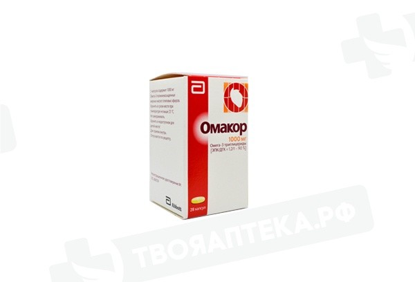 Фармакологическая группа: Гиполипидемическое средство Код ATX: С10АХ06 Фармакодинамика: Полиненасыщенные жирные кислоты класса омега-3 - эйкозапентаеновая кислота (ЭПК) и докозагексаеновая кислота (ДГК) - относятся к незаменимым (эссенциальным) жирным кислотам (НЭЖК). Омакор активен в отношении липидов плазмы крови, снижая концентрацию триглицеридов в результате уменьшения концентрации липопротеинов очень низкой плотности (ЛПОНП). Кроме того, он влияет на артериальное давление и гемостаз. Омакор снижает синтез триглицеридов в печени, так как ЭПК и ДГК являются менее активными субстратами для ферментов, ответственных за синтез триглицеридов, и они ингибируют этерификацию других жирных кислот. Снижению концентрации триглицеридов также способствует усиление Р-окисления жирных кислот в пероксисомах печени, за счет чего снижается количество свободных жирных кислот, доступных для синтеза триглицеридов. Ингибирование этого синтеза снижает уровень ЛПОНП. Омакор повышает уровень холестерина липопротеинов низкой плотности (ЛПНП) у некоторых пациентов с гипертриглицеридемией. Повышение концентрации холестерина липопротеинов высокой плотности (ЛПВП) минимально, значительно ниже, чем после приема фибратов, и непостоянно. Длительность гиполипидемического действия при приеме препарата Омакор более 1 года не изучалась. В остальном нет никаких убедительных доказательств, что снижение уровня триглицеридов снижает риск развития ишемической болезни сердца. В процессе терапии препаратом Омакор наблюдалось снижение синтеза тромбоксана А2 и незначительное увеличение времени свертывания крови. Существенного влияния на другие факторы свертывания крови не наблюдалось. Результаты клинического исследования GISSI-Prevenzione, полученные за 3,5 года наблюдений, показали существенное снижение относительного риска смертности от всех причин, нефатального инфаркта миокарда и нефатального инсульта на 15 % ([2-26] р=0,0226) у пациентов после недавно перенесенного инфаркта миокарда, принимавших препарат Омакор по 1 г в сутки. Дополнительно, относительный риск смерти по причине сердечно-сосудистой патологии, нефатального инфаркта миокарда и нефатального инсульта снижался на 20 % ([5-32] р=0,0082). Результаты другого клинического исследования GISSI-Heart Failure, в котором пациенты с хронической сердечной недостаточностью получали препарат Омакор по 1 г в сутки в среднем в течение 3,9 лет, показали снижение относительного риска смертности от всех причин на 9 % (р=0,041), снижение относительного риска смертности от всех причин и госпитализации по причине сердечно-сосудистых патологий на 8 % (р=0,009), снижение относительного риска первичной госпитализации по причине желудочковых аритмий на 28 % (р=0,013).