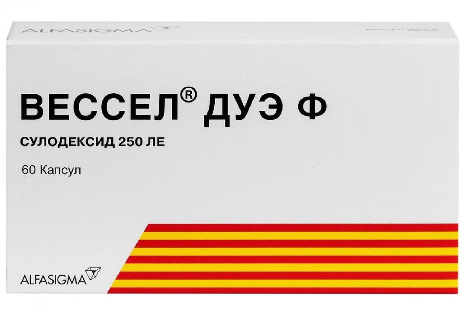 Фармакологическая группа: Антикоагулянты – гепарин и его производные. Фармакологические свойства: Вессел® Дуэ Ф (сулодексид) является биологическим лекарственным препаратом, представляющим собой естественную смесь гликозаминогликанов (ГАГ): гепариноподобной фракции с молекулярной массой 8000 дальтон (80 %) и дерматансульфата (20 %). Механизм действия сулодексида обусловлен двумя основными свойствами: быстродействующая гепариноподобная фракция обладает сродством к антитромбину III (АТIII), а дерматановая – к кофактору II гепарина (КГII). После перорального применения в рекомендованной дозировке количество сулодексида и его производных после эффекта первого прохождения достаточно для индуцирования антитромбинового действия без влияния на обычные параметры коагуляции (активированное частичное тромбопластиновое время (АЧТВ), тромбиновое время, активированный фактор X). Таким образом, можно предположить, что сулодексид при пероральном применении не имеет антикоагуляционного действия. Ангиопротекторное, профибринолитическое, антитромботическое действие. Фармакодинамика: Ангиопротекторное действие связано с восстановлением структурной и функциональной целостности клеток эндотелия сосудов, с восстановлением нормальной плотности отрицательного электрического заряда пор базальной мембраны сосудов. Кроме того, препарат нормализует реологические свойства крови за счёт снижения уровня триглицеридов (стимулирует липолитический фермент – липопротеинлипазу, гидролизующую триглицериды, входящие в состав ЛПНП). Эффективность применения препарата при диабетической нефропатии определяется способностью сулодексида уменьшать толщину базальной мембраны и продукцию экстрацеллюлярного матрикса за счёт снижения пролиферации клеток мезангиума. Профибринолитическое действие обусловлено повышением в крови уровня тканевого активатора плазминогена и снижением содержания его ингибитора. Антитромботическая активность сулодексида, назначаемого внутрь, является, главным образом, результатом всех видов действия, которые сулодексид оказывает на сосудистую стенку (ангиопротекторное действие), фибринолиз (профибринолитическое действие) и ингибирование адгезии тромбоцитов.